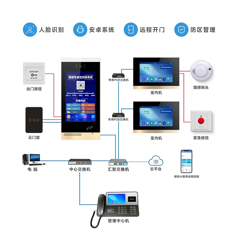 門禁對(duì)講一體機(jī)、門鎖、閉門器,電源等設(shè)備。門禁對(duì)講一體機(jī)實(shí)現(xiàn):圖文視頻廣告在線播放,支持人臉識(shí)別開鎖,密碼開鎖,IC刷卡開鎖,可對(duì)接呼叫數(shù)字分機(jī)開鎖,模擬分機(jī)開鎖,電梯聯(lián)動(dòng)等功能,系統(tǒng)可在線遠(yuǎn)程升級(jí)維護(hù)。將前端人員出入刷卡開鎖的身份信息、數(shù)據(jù)信息及采集到的各種門禁記錄等信息后傳回到系統(tǒng)后臺(tái)進(jìn)行處理。